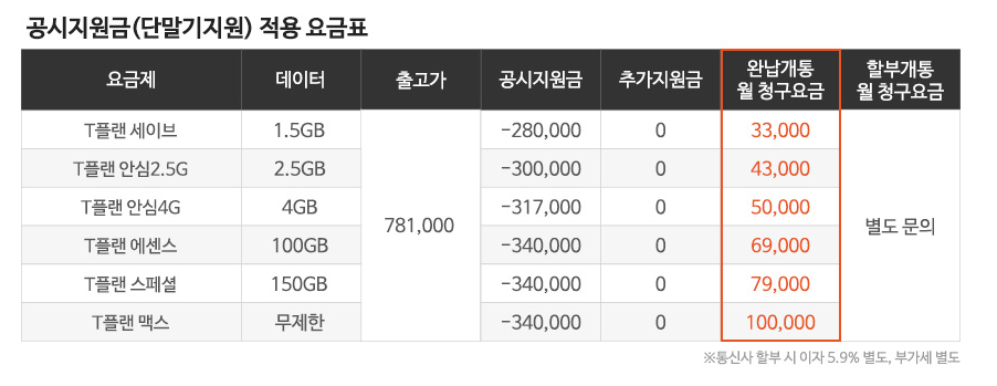 나는 좀 비싼 요금을 사용하고 있다면 아예 현금완납 가격이 천원짜리가 있습니다. 그대신 이제품은 T플랜 맥스를 사용해야합니다. 월 십만원을 내야 하지요. 이건 현금완납이라고는 볼수가 없겠지요. 하지만, 그대신 할부 이자가 따로 없습니다. 물론 180일 즉 6개월 지나면 요금을 낮출수는 있습니다.